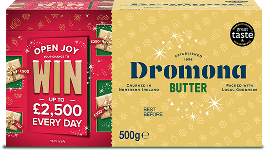 We’re getting ready to open joy! Starting 1st November 2025, enter your unique code from a promotional Dromona Butter pack to open one of our festive doors for a chance to win amazing cash prizes everyday. Values to be won are £25, £50, £100, £250, £500 and £2,500!